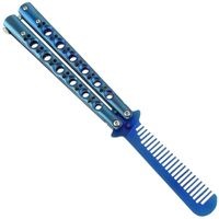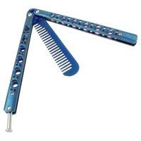 バタフライナイフのような形状の「櫛(くし)」です。 バタフライナイフタイプの二分割グリップになっており、 使用する時は、グリップ後端部の固定をはずし グリップ部分をそれぞれ左右に可動させ、再度固定して使用します。 ポケットサイズでストッパーも付いているので収納時もしっかり固定されます。 ■サイズ: ・収納時:全長約14cm 幅約3cm ・オープン時:全長約23cm 幅約3.4cm ・櫛部:約9cm ■カラー: ネイビー ■重量: 約120g前後目安 ※個体差があります ■素材: ステンレス ■状態: ロットにより若干のデザイン変更がある場合もございます。 ■その他: ・ナイフの形を模したものなので、「刃物」ではありません。 ・ご使用状況によっては振動等でネジが緩くなる場合がありますので、その際はネジを固定し調節してください。 ・グリップの固定金具を扱う際に、とてもかたい商品があります。 ・コーム部分の角が少し鋭いので取り扱いには注意して下さい。 ■コメント: 収納時には一見バタフライナイフに見え、グリップ(柄)の部分をオープンさせると、本当に櫛として使用できます。そのまま櫛を持ち歩くよりも、魅力的だと思う方もいらっしゃると思います。 実際にバタフライナイフのようなアクションができるかどうかの保証はありません。 あくまで、「二分割グリップの折りたたみタイプ」としてお買い求めください。 |